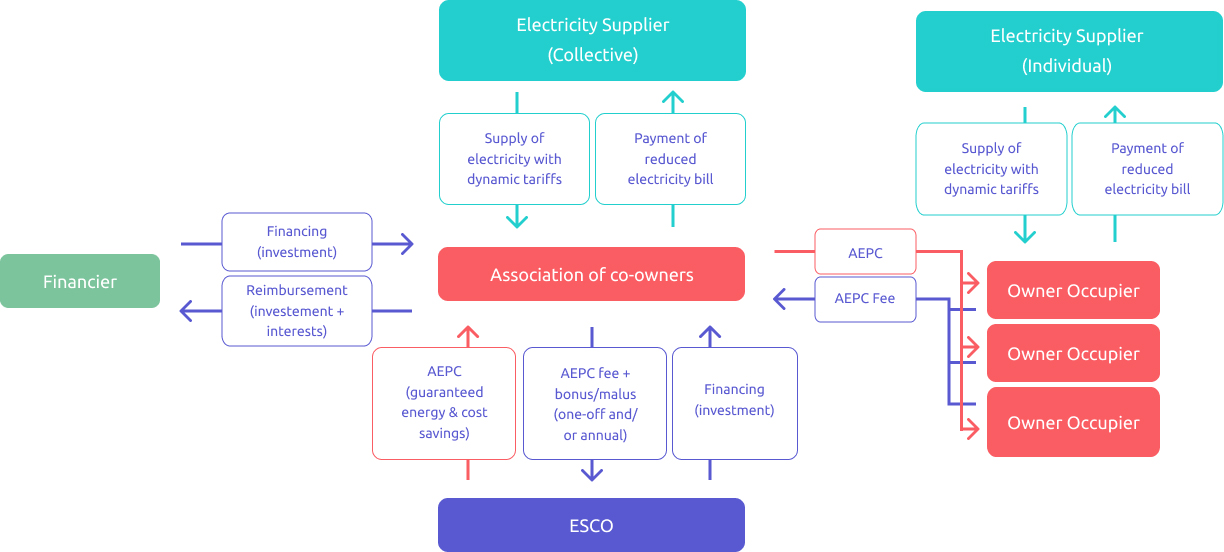 In this variation, the only difference is the fact that the financier directly finances the Association of Co–Owners (ACO), rather than the Energy Services Company (ESCO). As in the generic case, this shifts the credit risk from the ESCO to the Financial Institution (FI) which may be a more suitable solution, as a FI is probably better equipped to assess and manage risks at the level of an individual co-owner. Mortgage-based solutions are another familiar option for banks. They would already have a license for providing loans, which is much less likely to be the case for ESCOs unless the ESCO is specialized in this sector and obtains the necessary licenses to provide customer loans to residential apartment owners.