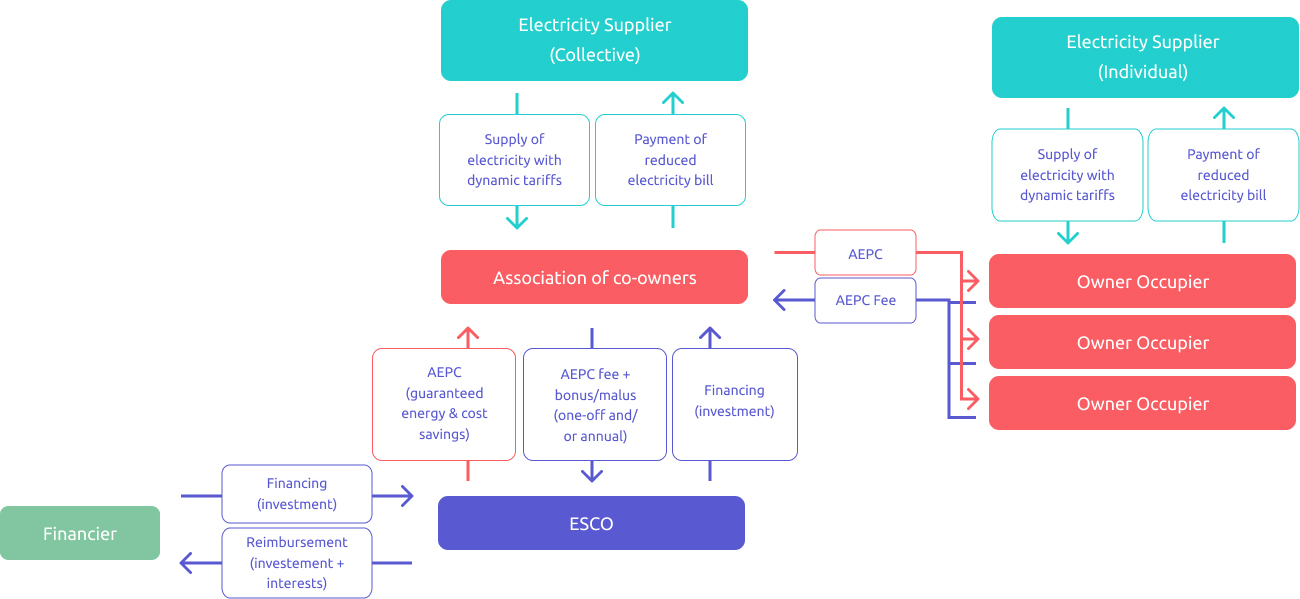 In terms of electricity contracts that need to deliver dynamic pricing, they are mainly between electricity suppliers and the individual owner occupiers, but there may also be a collective contract between the ACO and another electricity supplier for the common parts of the building. Each may allow for different levels of flexibility corresponding to the equipment, the usage and the available tariffs.
