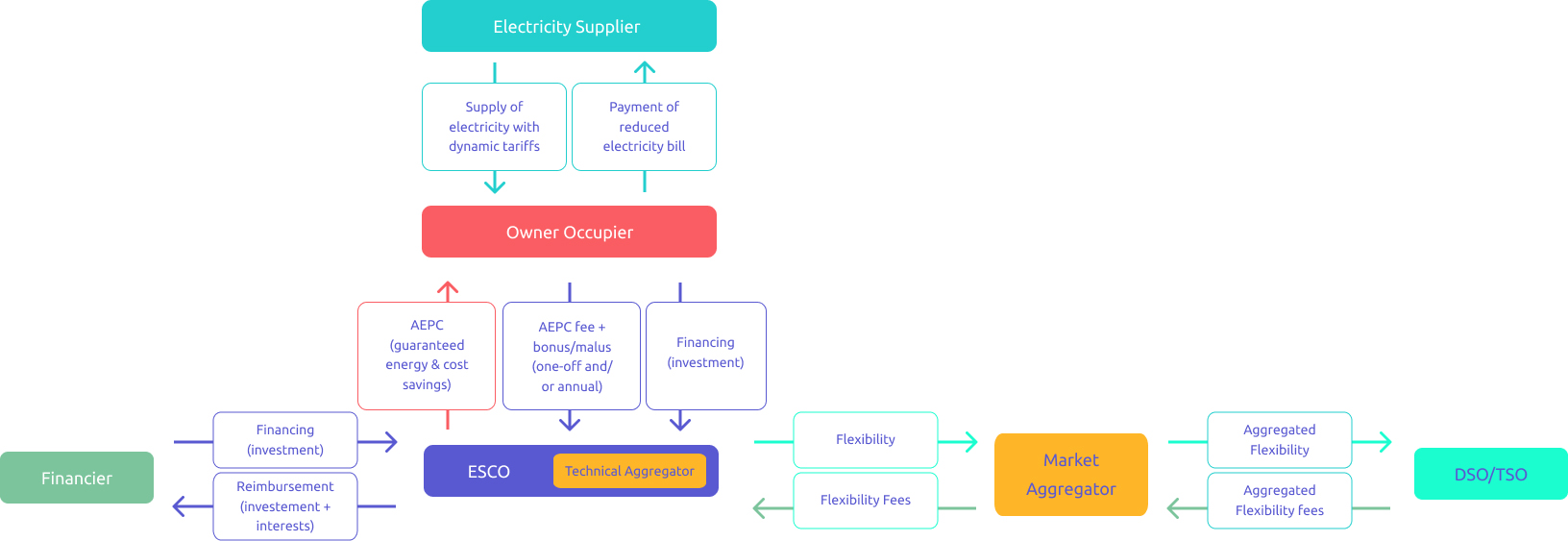 In this variation, the Energy Services Company (ESCO) implements explicit Demand Response (DR) and sells it to the flex requesters. This means that the ESCO plays itself the role of the aggregator and explores and manages the flexibility potential at the customer’s building site(s). The ESCO provides this flexibility directly to a Distribution System Operator (DSO)/Balance Responsible Party (BRP)/Transport System Operator (TSO) who is willing to pay certain fees for the use of flexibility.
