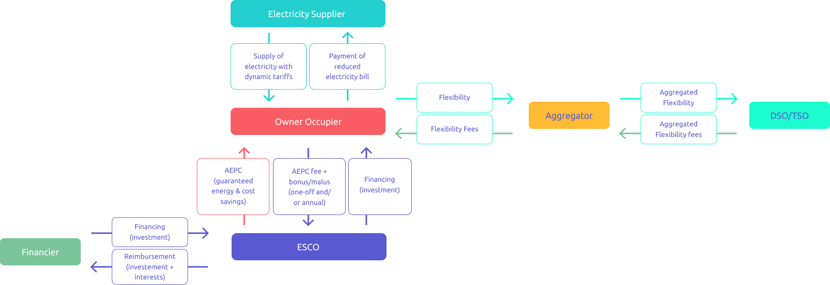 In this case, the role of the ESCO is just to provide the technology and manage the availability of the equipment and active control software, but the explicit DR contract (incl. the service level agreement) is typically signed between the Owner occupier and the Aggregator. The aggregator, in turn, provides flexibility to a Distribution System Operator/Balance Responsible Party/Transport System Operator who is willing to pay certain fees for its use.