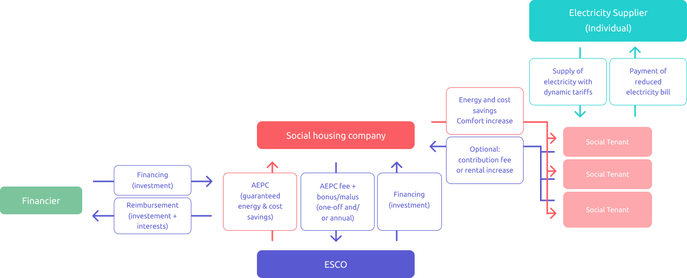 The Business Model variation is similar to the general model of one (public) building owner from the point of view of the ESCO, but it is much more complicated for the Social Housing Company (SHC) to build a profitable business case. As the energy savings from energy renovation and renewable energy or cost savings from flexibility benefit entirely the social tenant (similarly as with tenants in case of privately co-owned apartments), there is no real return on investment for the SHC.